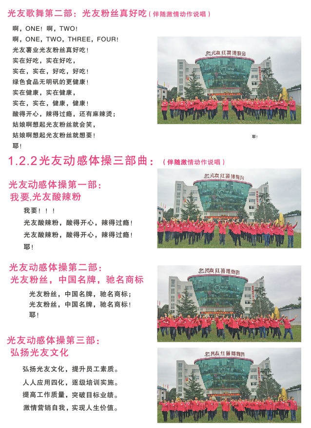 光友薯業(yè)歷來重視企業(yè)文化的發(fā)展和創(chuàng)新,29年來,已形成獨具特色、富有激情、 富有正能量的企業(yè)文化,光友文化是光友薯業(yè)的靈魂,是光友人共有的價值觀和行為準則,對員工無時不產(chǎn)生指導(dǎo)、熏陶、感染、規(guī)范的潛移默化作用,是形成團隊凝聚力的原動力,引導(dǎo)員工積極進取,快樂生活、快樂工作、走向成功。